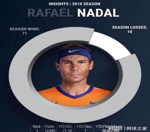 纳达尔 2010赛季,胜率87.7%,红土全胜,夺得三个大满贯冠军。