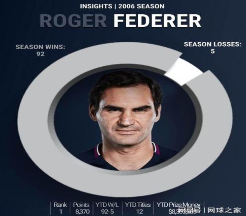 费德勒 2006赛季,胜率94.8%,以16连胜开启赛季,最终夺得三个大满贯冠军。