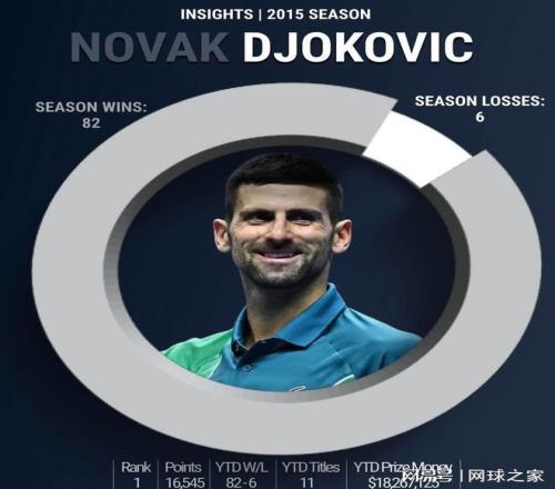 德约科维奇 2015赛季,胜率93.2%,除一项赛事外,他在参加的其它赛事都打进了决赛,夺得三个大满贯冠军。