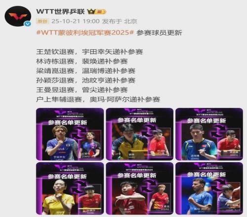 北京时间今天(10月21日)19时,WTT世界乒联发布WTT蒙彼利埃冠军赛2025参赛球员更新: