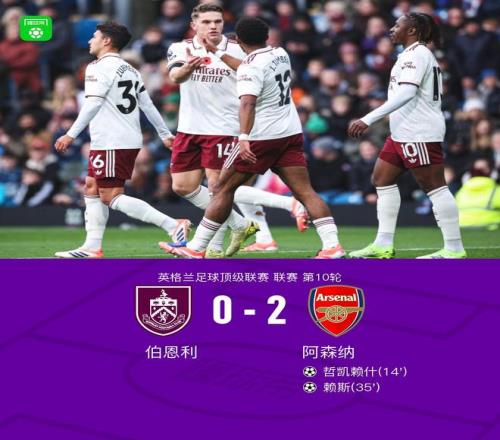 北京时间11月1日,英超联赛第10轮,伯恩利坐镇主场迎战阿森纳。上半场,哲凯赖什先拔头筹,特罗萨德助攻赖斯头球破门;下半场,恩瓦内里远射造险,爱德华兹最后时刻任意球中柱。最终,阿森纳客场2-0完胜伯恩利,继续领跑英超。