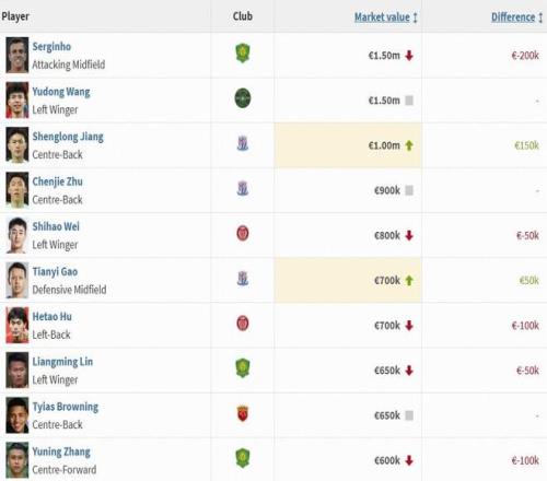 北京时间12月17日,德转发布新一期中超球员身价。塞尔吉尼奥、王钰栋以150万欧位居国内球员身价榜首,3-5位分别为蒋圣龙、朱辰杰、韦世豪。